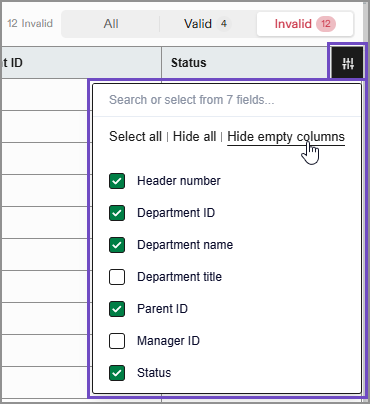 Check boxes: Select the columns that you want to see or hide from the list based on your import sheet.