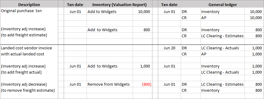 Example 1. Actual landed cost invoiced in same period as original purchase with estimate