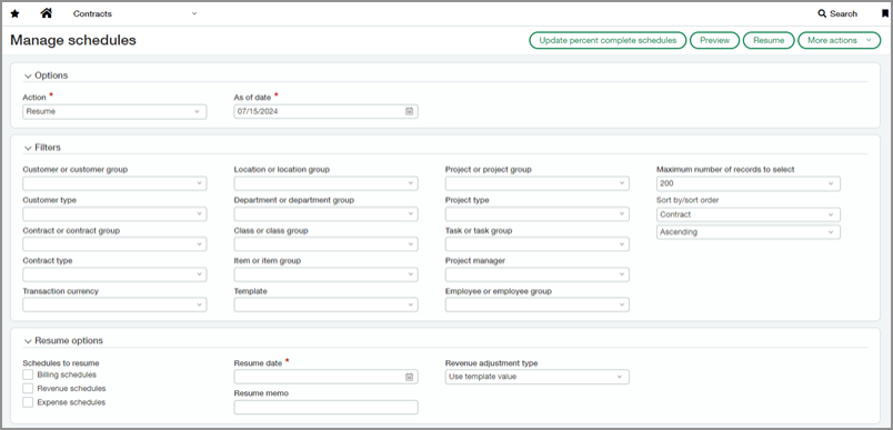We've added the ability to hold and resume schedules from the Manage Schedules page. Now you can manually hold or resume billing, revenue, and expense schedules in bulk across multiple contracts, eliminating the need to access each contract individually. When you hold or resume contract line schedules, Intacct creates a bulk action run record and runs the process offline.