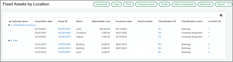Fixed Assets by Location: Displays a list of assets grouped by location, along with additional details about the assets.