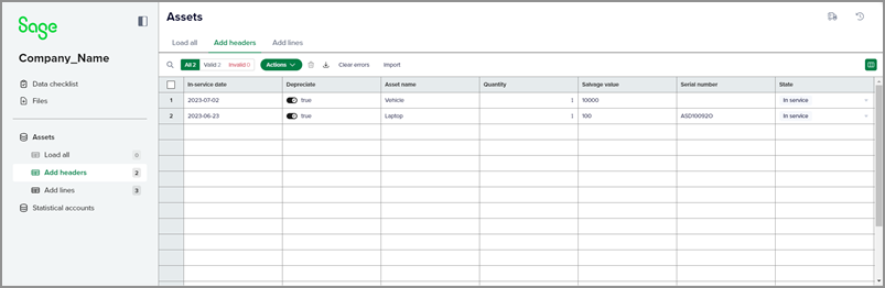 The import service extracts the file data into a workspace. Assets are added to the Add headers sheet and depreciation rules are added to the Add lines sheet.