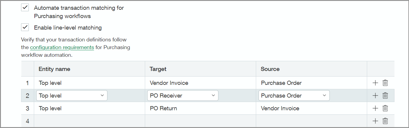 You can now map multiple target transaction definitions to a single source definition in your Purchasing configurations. This is useful when the source transaction could be matched to more than one target transaction type. For example, a purchase order could match to a vendor invoice or a receiver document.