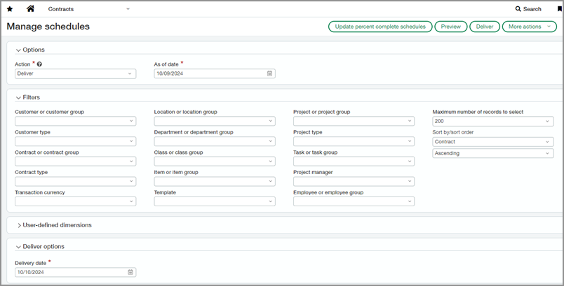 Now you can manually clear or deliver in bulk across multiple contracts, eliminating the need to access each contract individually. When you initiate these actions, Sage Intacct creates a bulk action run record and runs the process offline.